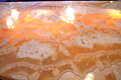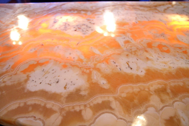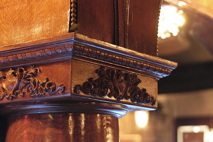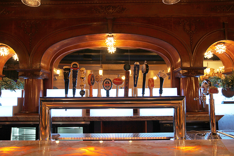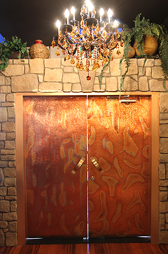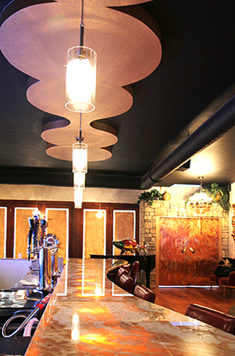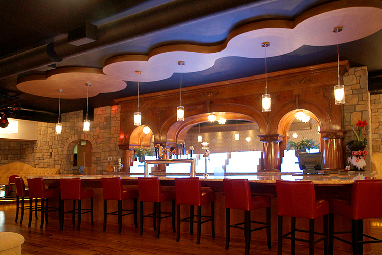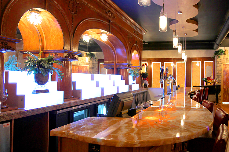 areas as well as the curved onyx bar. Custom table bases were designed to add character and lighting fixtures were specifically selected to accent each